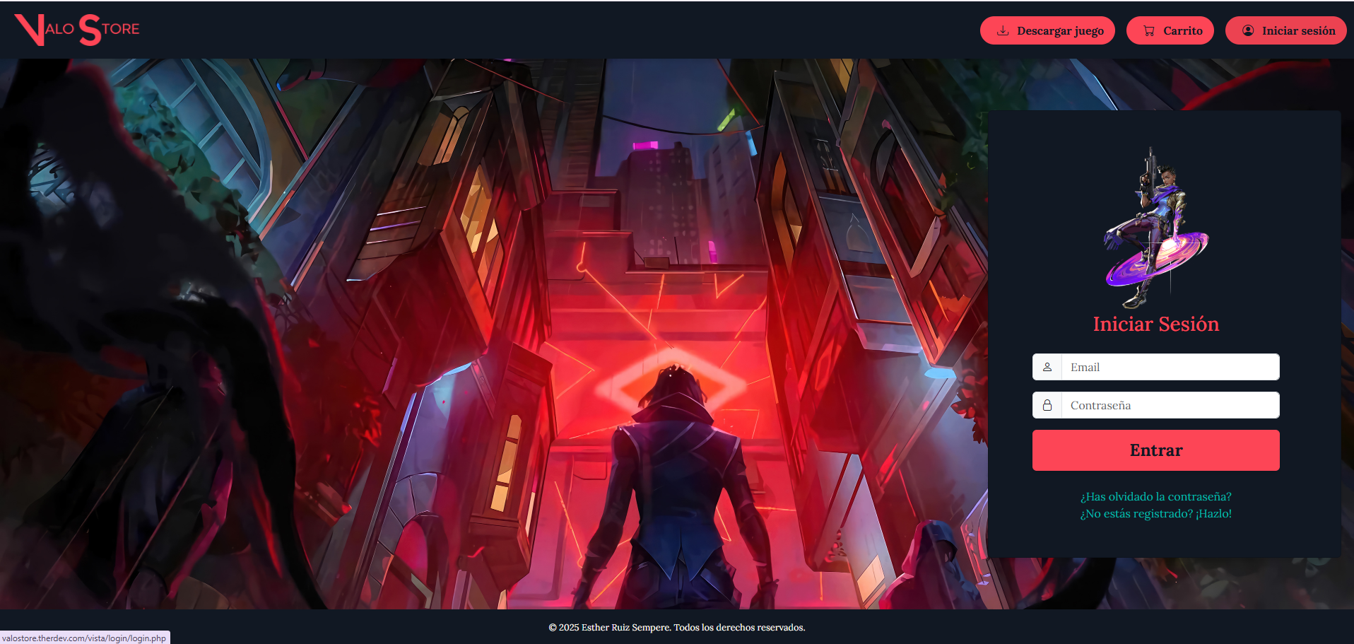Plataforma completa de e-commerce que simula la compra y adquisición de personajes del videojuego Valorant. Incluye un flujo de compra funcional con simulación de integración de pago con tarjeta, gestión de inventario y funcionalidades básicas de usuario. Desarrollo Full-Stack (frontend y backend).